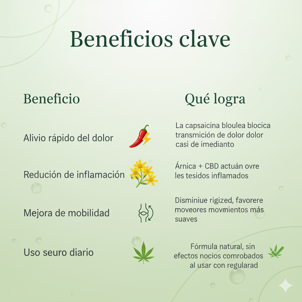 ✔️ Triple acción natural comprobada — Combina capsaicina, árnica y CBD para actuar sobre dolor, inflamación y rigidez.