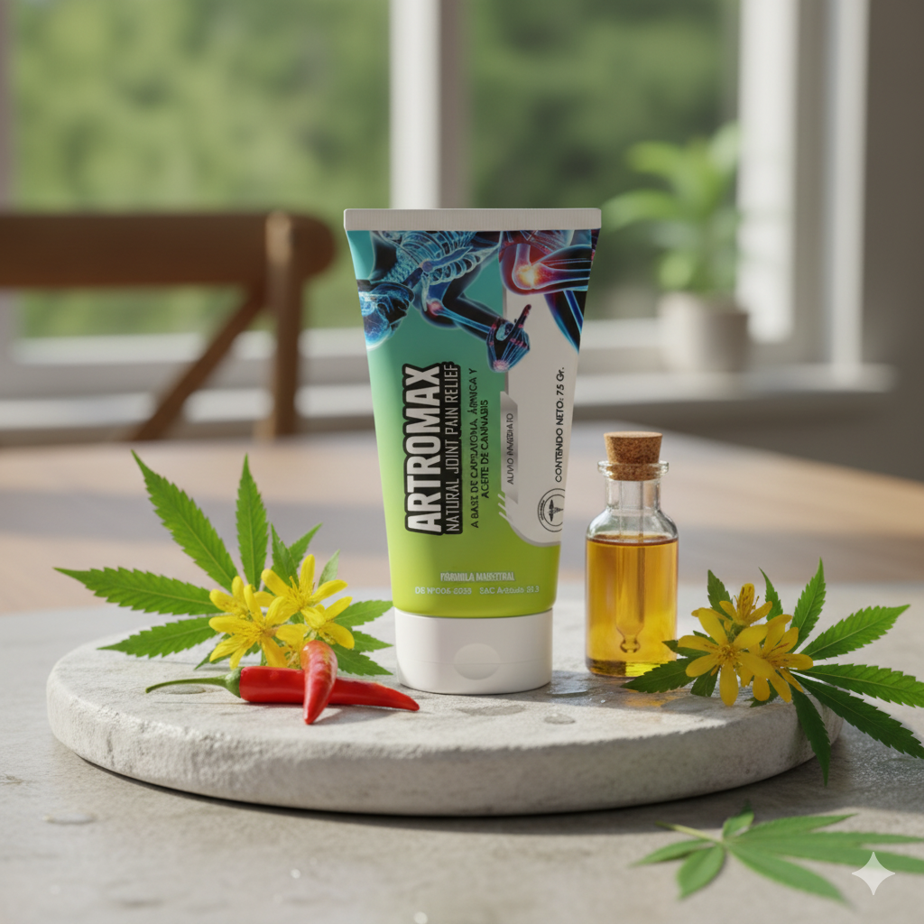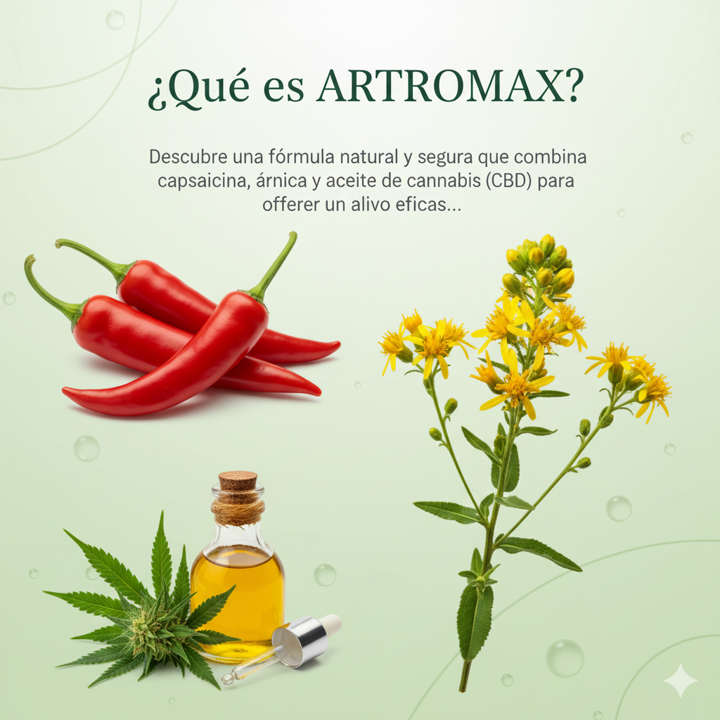 ARTROMAX es una crema terapéutica formulada con ingredientes naturales como capsaicina, árnica y aceite de cannabis (CBD) que actúan directamente sobre el dolor y la inflamación.