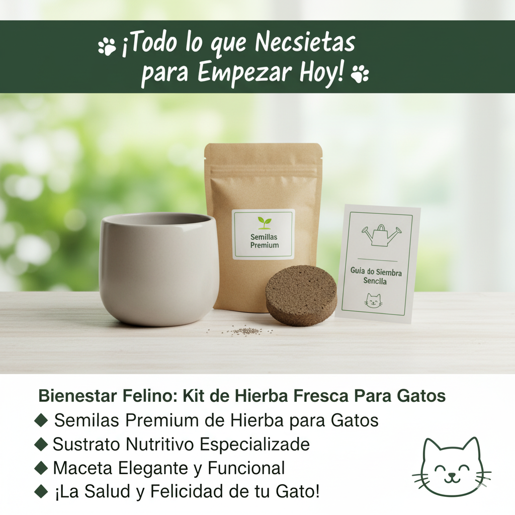 Imagina transformar el bienestar de tu gato con un simple gesto, ofreciéndole una fuente de salud y alegría que perdure. Con elBienestar Felino: Kit de Hierba Fresca, cada brote verde es un paso hacia una digestión óptima y un alivio natural para las bolas de pelo.